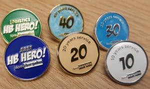 Pin badges supplied to our client, showing two different techniques of enamel infilling, with the years of service badge having a smooth finish.