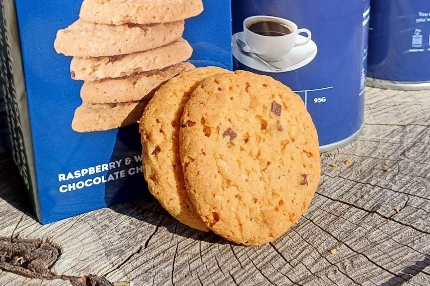 These biscuits – a raspberry and white chocolate chip cookie – are baked for us in Yorkshire. Great consistency of biscuit; not to crumbly for dunking in your coffee, but not hard on your teeth. The raspberry pieces – with apple & raspberry puree content too – may give you a feeling of healthy overtones when savouring! We are currently offering this flavour of cookie with a shorter lead time and reduced quantities from just 100 boxes, with a full bespoke wrap design. Please read further here and enquire for more details; ask for a sample with our quotation.